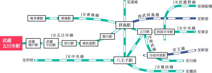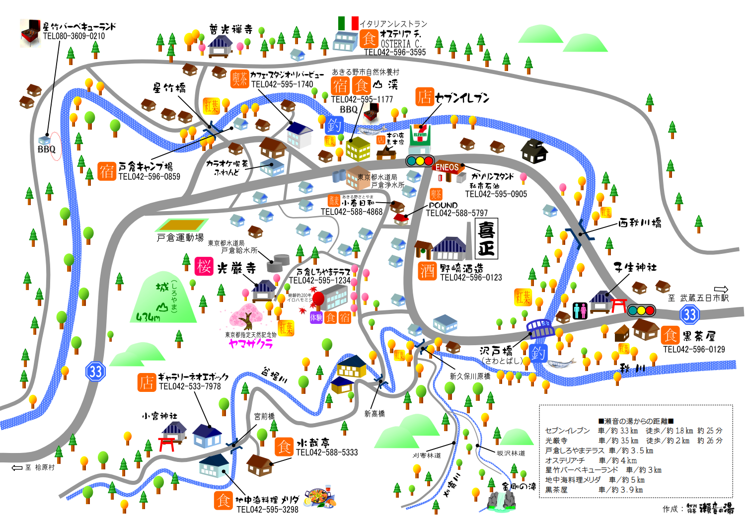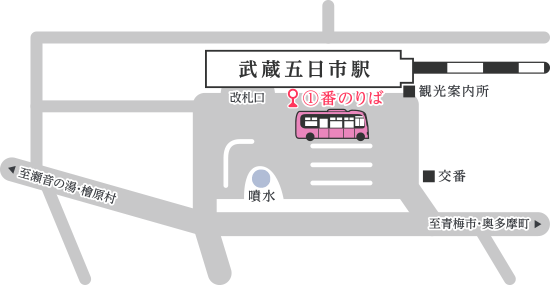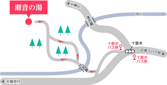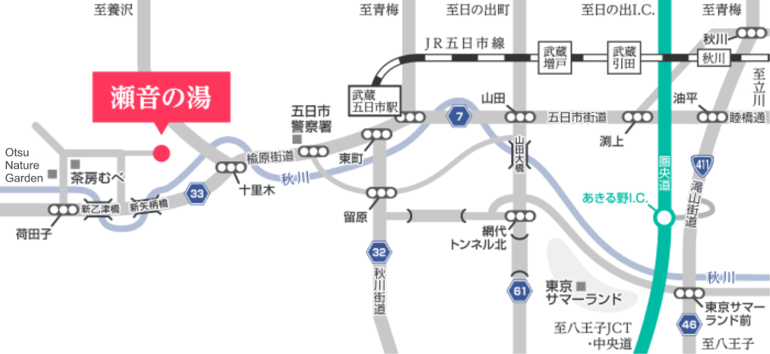 비고 | JR 이츠카이치 선 에서 무사시이츠카이치 역 ’ 하차, 니시도쿄 버스 에서 ‘ 세오토노유 ’ 하차 바로 앞. 셔틀버스는 없지만 호텔까지 유료 노선버스가 있습니다.(니시도쿄 버스) |